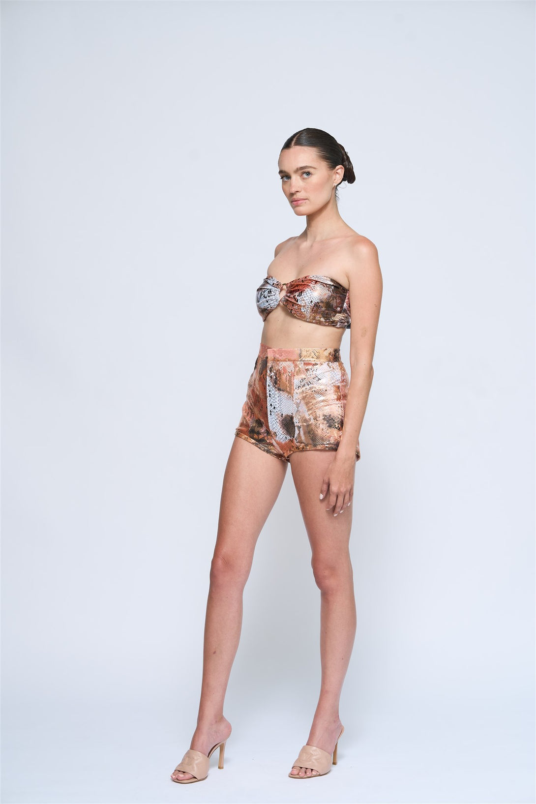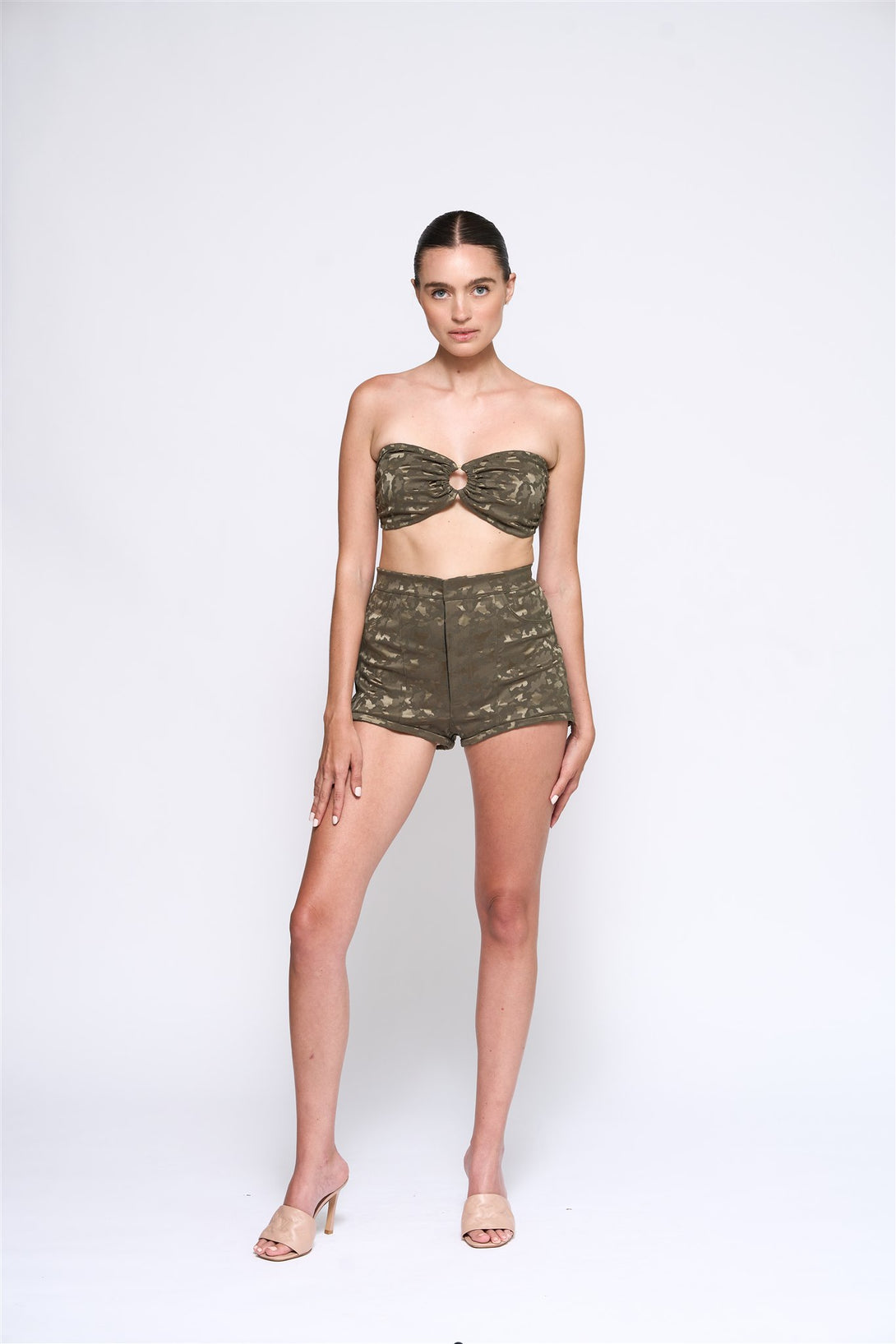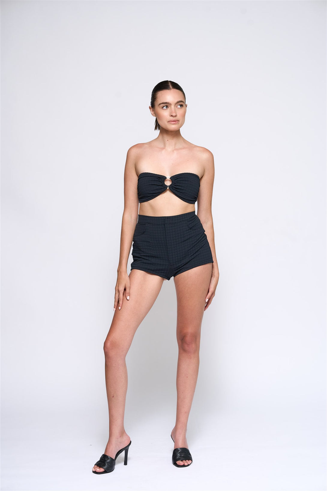 BROOKE SHORTY embraces retro style with its high-waisted shorts and ruched bandeau top. A fashionable, structured silhouette that balances support, character, and sensuality.
