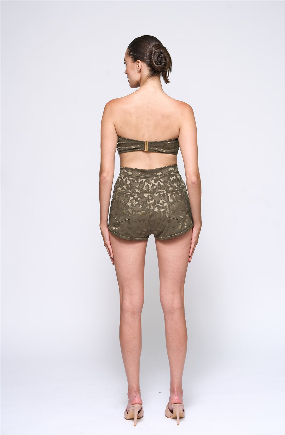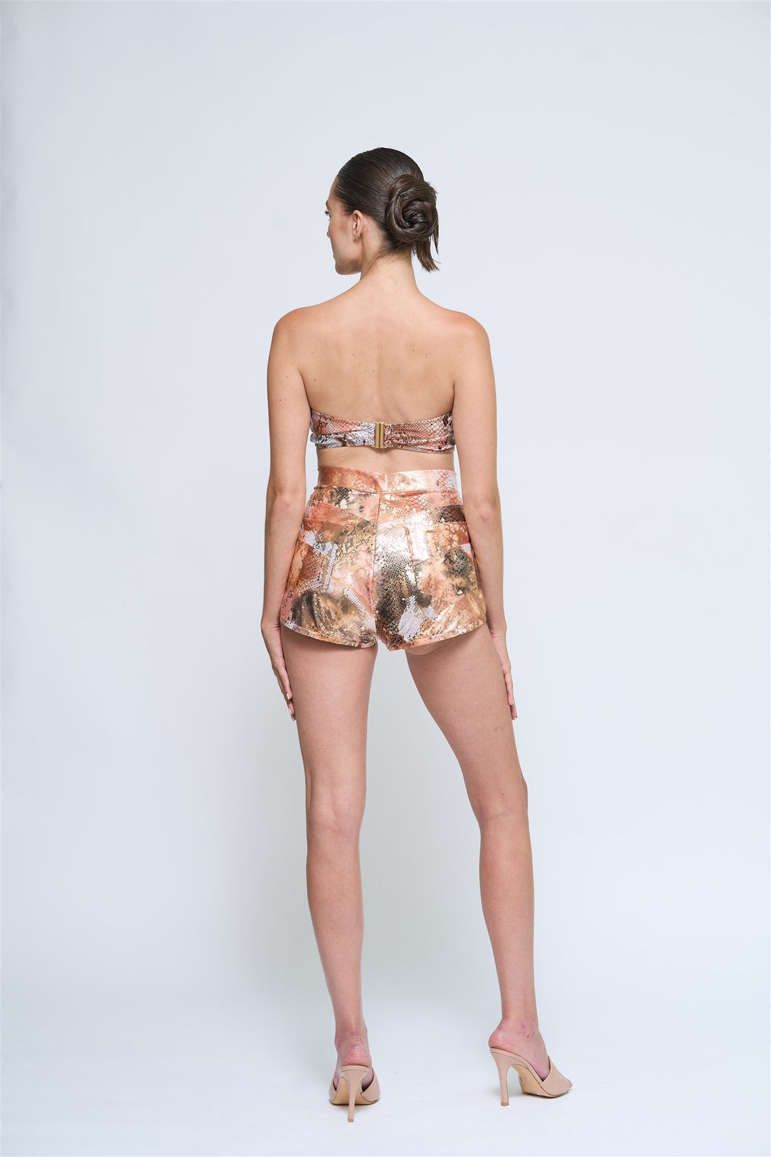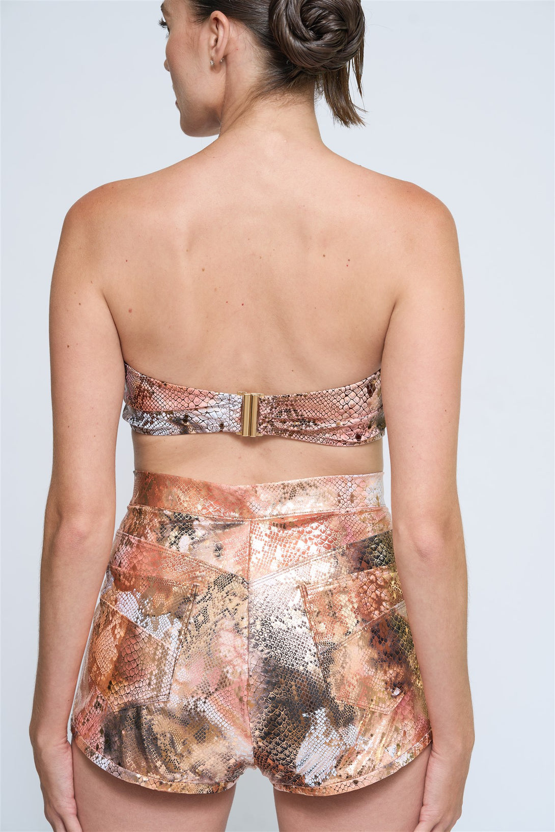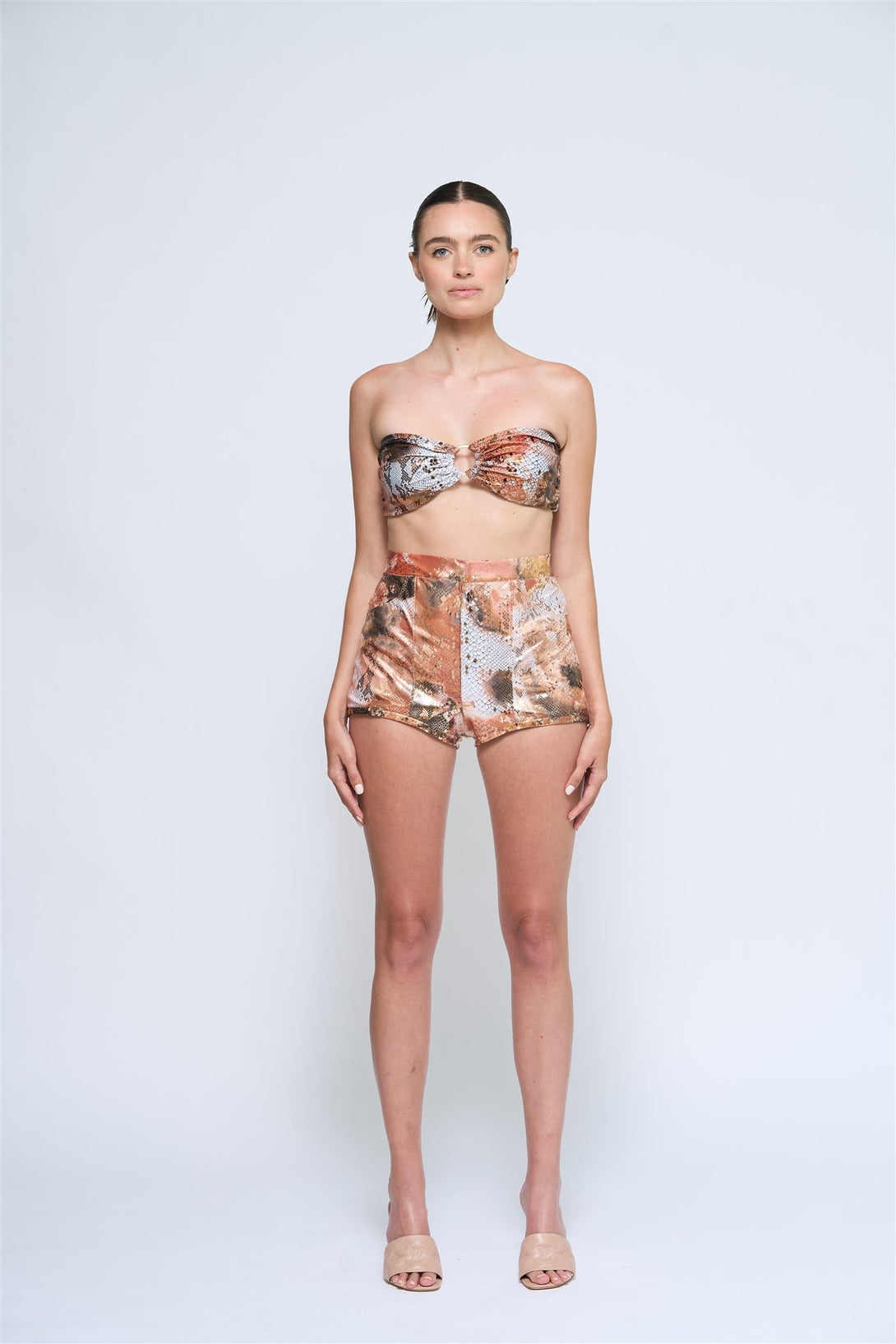 BROOKE SHORTY embraces retro style with its high-waisted shorts and ruched bandeau top. A fashionable, structured silhouette that balances support, character, and sensuality.