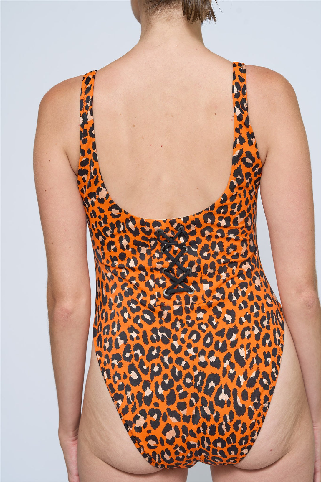 LINDSEY is the collection’s favorite piece. With its flamboyant leopard print, lace-up back, and structured cut, it boldly expresses radiant, confident femininity.